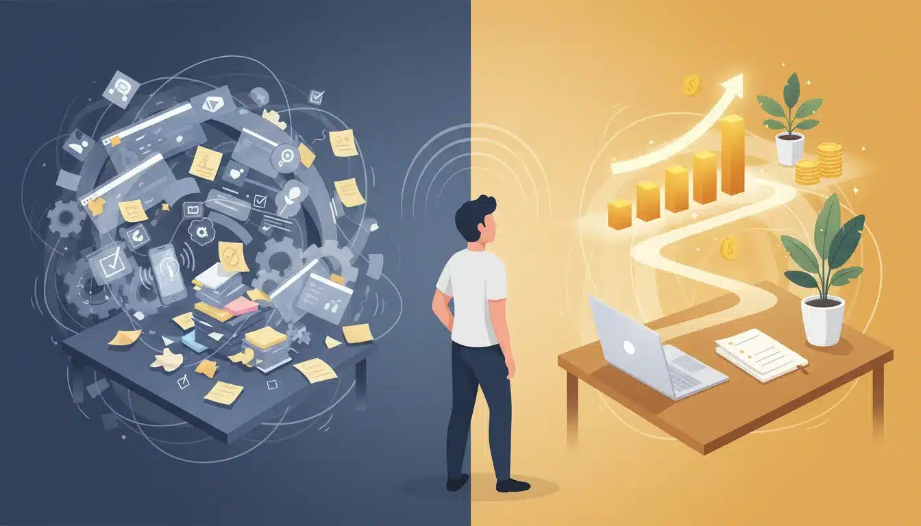 Toxic productivity is the trap of being constantly busy without asking whether your activity actually moves the needle. It feels good to check boxes, try new tools, or start another project, but that busyness often hides a lack of focus and results.